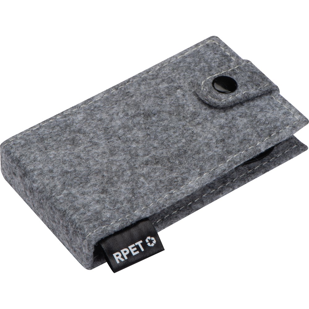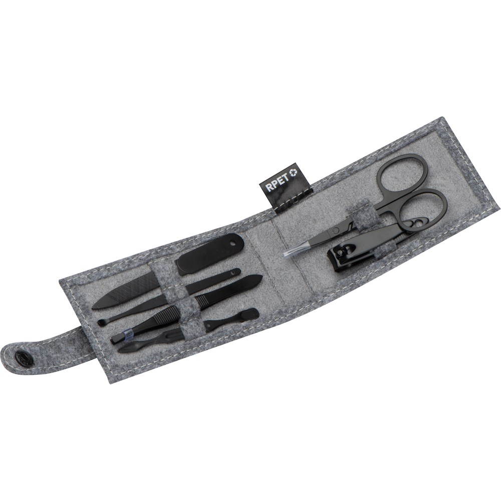 Ansprechendes Manikürset aus recyceltem RPET Filz . Es verfügt über eine Nagelschere, Nagelfeile, Nagelknipser, Pinzette sowie zwei Nagelhautschieber. Ihre Werbung bringen wir vorne auf dem Etui an.