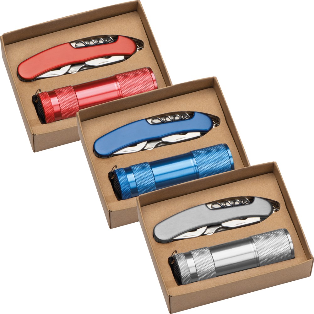 Set bestehend aus einer Aluminiumtaschenlampe mit neun LED's und einem Taschenmesser. Ihre Werbung lasern wir auf die Taschenlampe und das Taschenmesser in gleicher Größe. Inklusive drei AAA-Batterien.