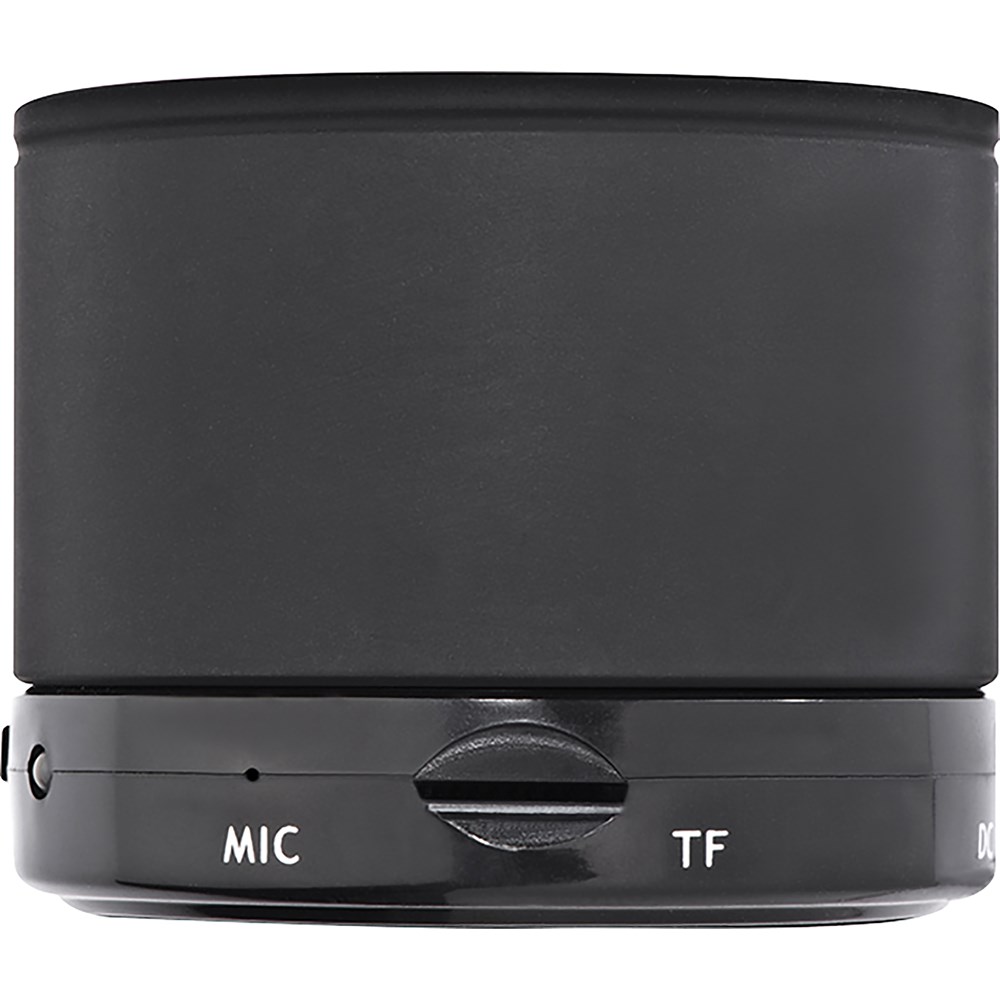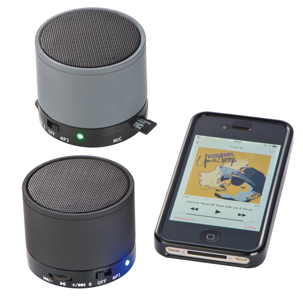 Mini Bluetooth Lautsprecher mit USB Anschluss zum Aufladen, einer Reichweite bis zu 10 Metern, Ladezeit ca. 2h und einer Laufzeit von bis zu 1,5 Stunden. Ihre Werbung wird auf den Lautsprecher gelasert.