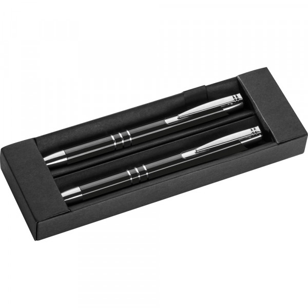 TOP PRICE! Metall Schreibset, bestehend aus einem Kugelschreiber mit blauschreibender Großraummine und einem Druckbleistift, umweltfreundlich verpackt im Pappetui. Ihre Werbung lasern wir rechts vom Clip am Schaft auf beiden Schreibgeräten.