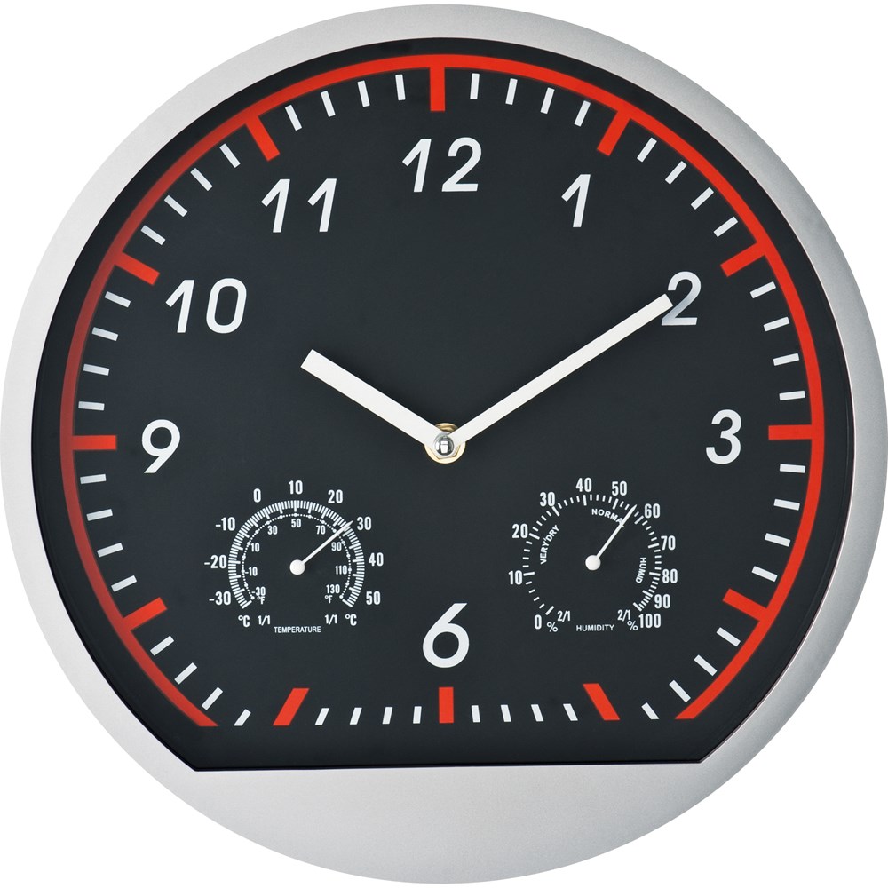 Wanduhr im coolen Sportdesign. Die Uhr verfügt über ein Thermo- und ein Hygrometer. Ihre Werbung... mehr