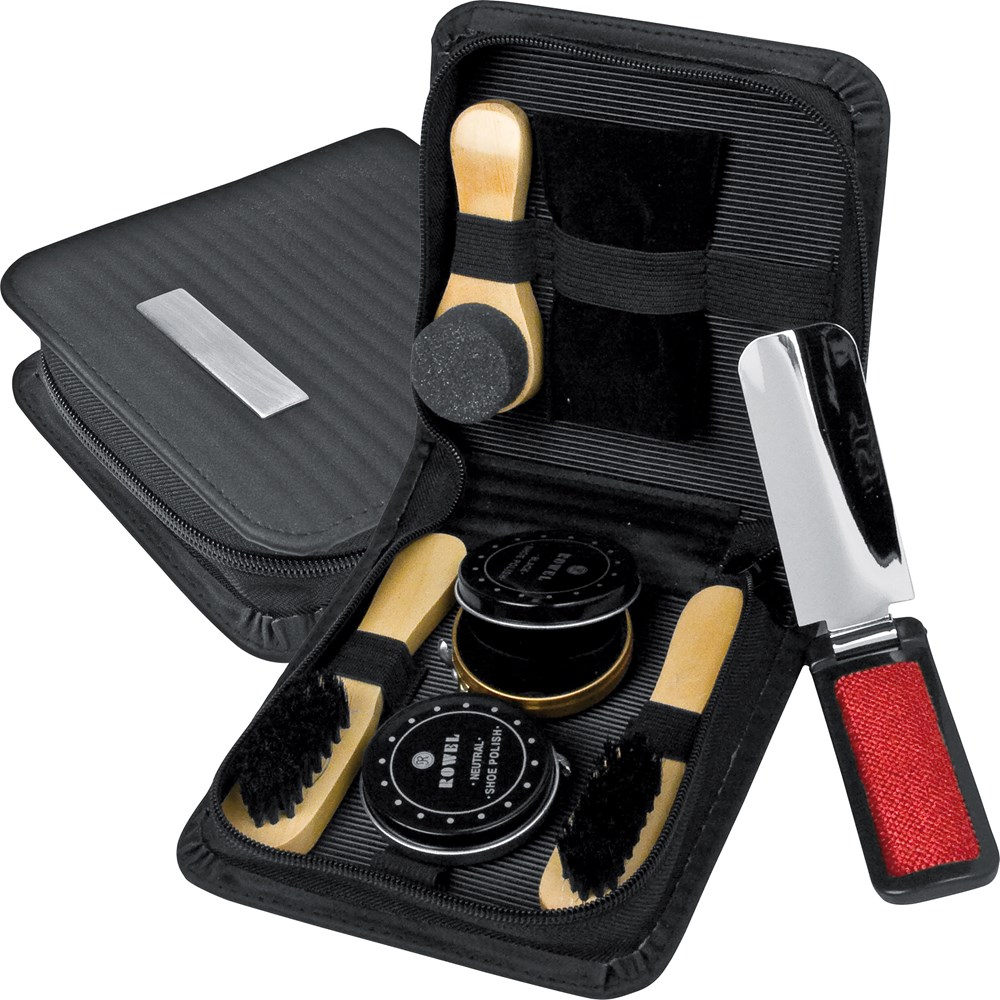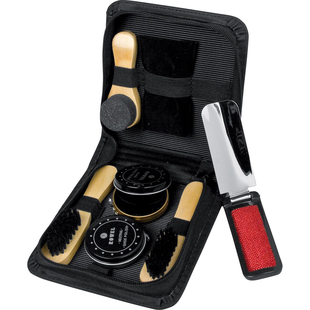 Schuhputzset bestehend aus zwei Bürsten, einem Schuhlöffel aus Metall mit Kleiderbürste, zwei Schuhcremes (schwarz und farblos), einem Tuch und einem Cremeauftrage-Schwamm. Ihre Werbung lasern wir auf das Metallemblem.