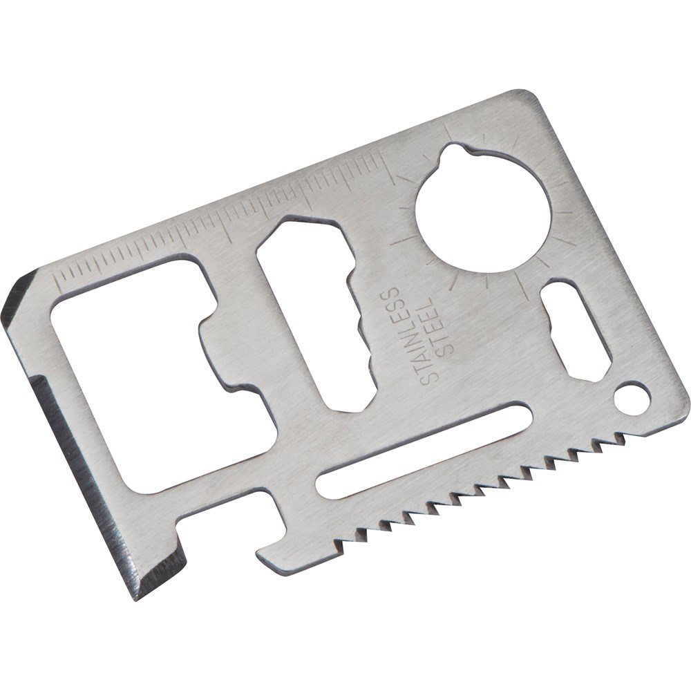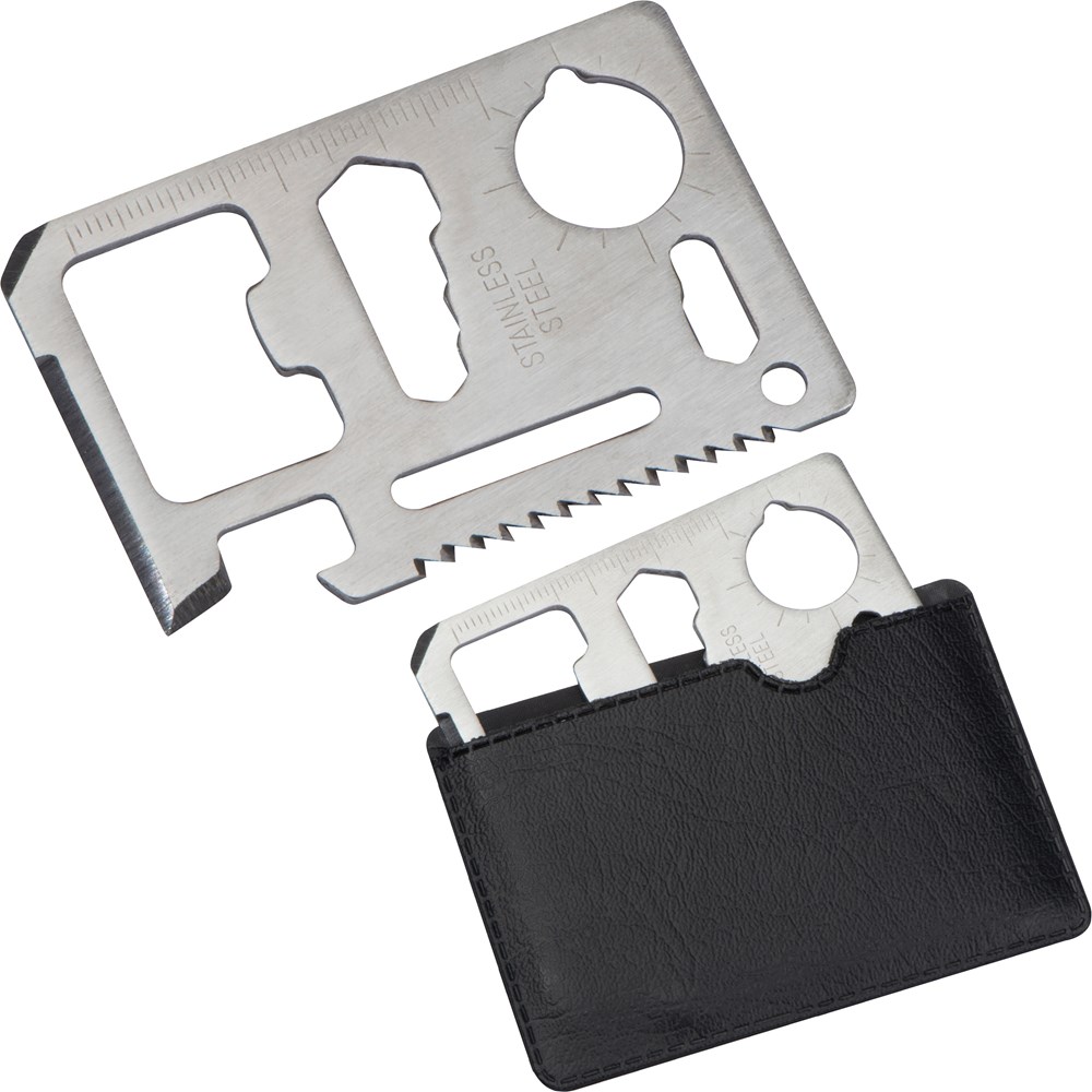 16in1 Multitool aus Edelstahl im Hosentaschenformt. Der praktische Begleiter verfügt über die folgenden Features: PU-Etui, Dosenöffner, Messer, Schraubendreher, Flaschenöffner, Lineal, 4 verschieden große Sechskantschlüssel (6/7/8/10mm), Winkelmesser, 2 verschieden große Sechskantschlüssel (4/5mm), Aufhängeöse, Säge, Flügelschraubenschlüssel. Ihre Werbung gravieren wir auf das Tool.