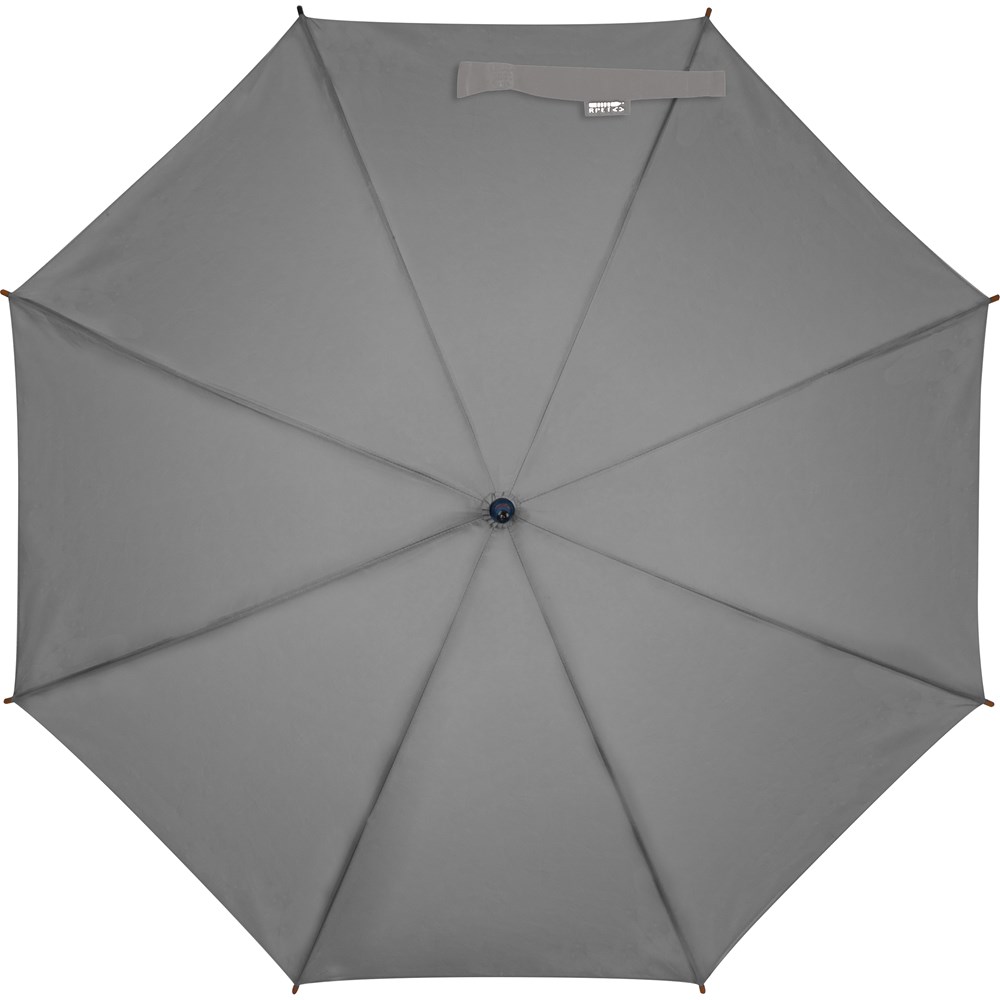 Hochwertiger Automatikregenschirm mit Fiberglasgestänge, Bespannung aus recyceltem PET und gebogenem Holzgriff. Ihre Werbung wird auf ein Segment gedruckt.
