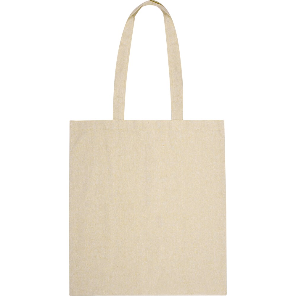 Oeko-Tex® STANDARD 100 zertifizierte, Tasche aus recycelter Baumwolle mit langen Tragehenkeln und einer Grammatur von 140g/m². Die Werbung wird auf eine Seite der Tasche gedruckt.