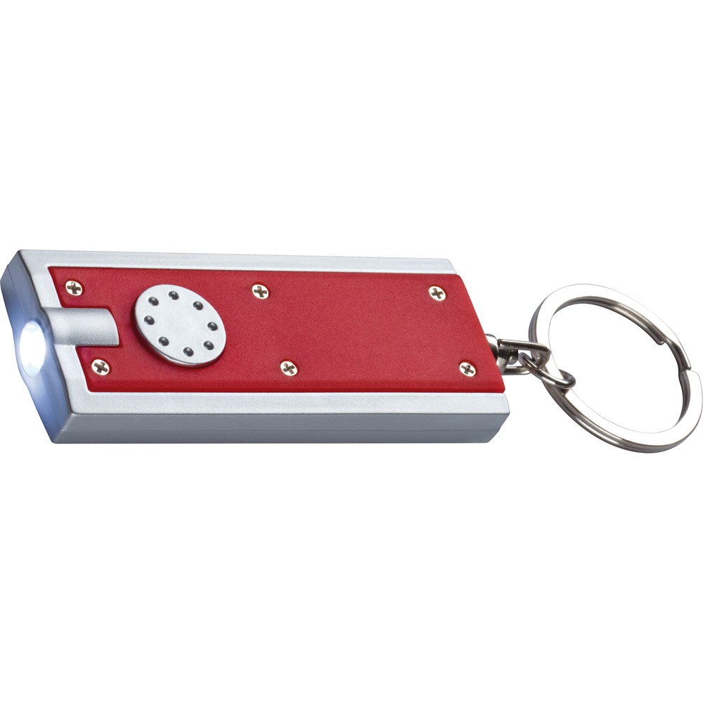 Rechteckiger Schlüsselanhänger mit integriertem LED Lämpchen und Schlüsselring aus Metall. Zwei Knopfzellen sind im Lieferumfang bereits enthalten. Ihre Werbung drucken wir auf die Seite gegenüber des Druckknopfes.