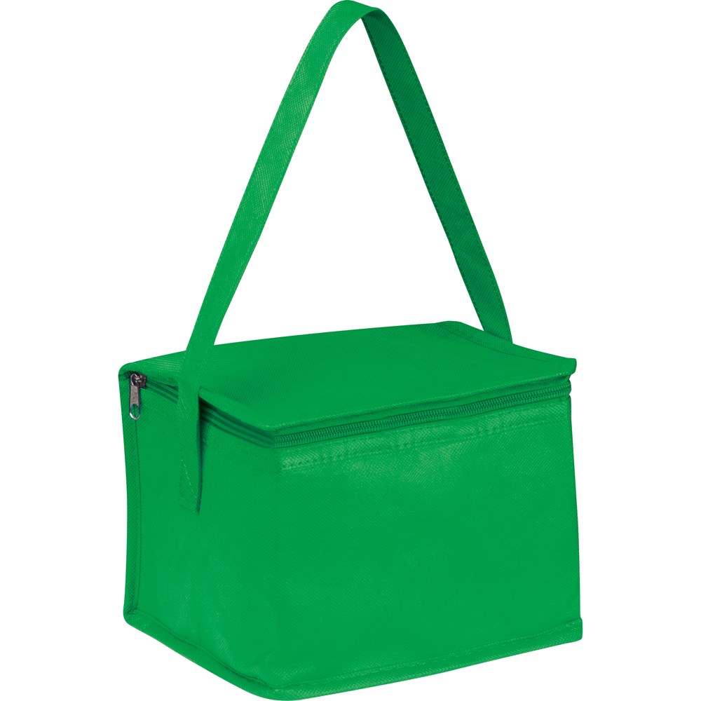 Non Woven Kühltasche passend für 6 stehende Getränkedosen (0,33 Liter) mit Trageschlaufe. Der Werbeaufdruck erfolgt mittig auf den Deckel.