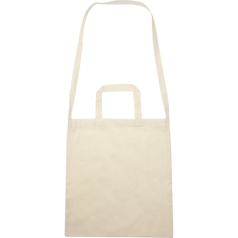 Oeko-Tex® STANDARD 100 zertifizierte Tasche aus Baumwolle mit einer Grammatur von 140g/m² und einem langen Henkel zum Umhängen sowie zwei kurzen Tragehenkeln. Der Werbeaufdruck erfolgt auf eine Seite der Tasche.