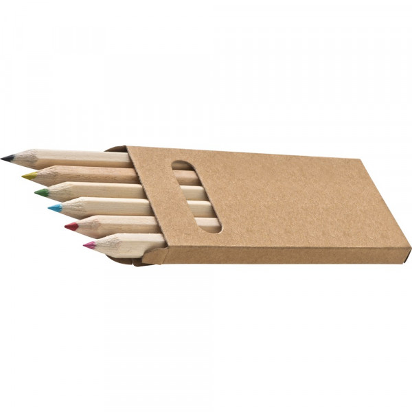 6 kurze Buntstifte im Pappetui. Ihre Werbung wird auf den Karton gedruckt.