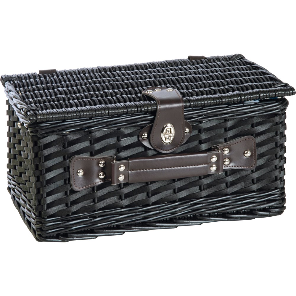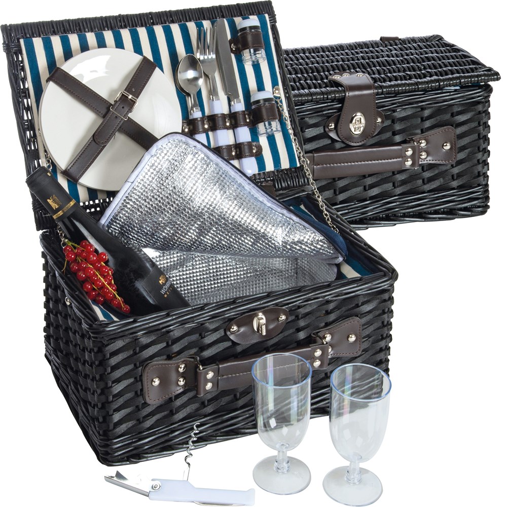 Mini-Picknick-Kühlkorb aus Weidengeflecht für zwei Personen mit Keramiktellern und -tassen, Edelstahlbesteck und Salz- und Pfefferstreuer. Ihre Werbung lasern wir auf ein Metallemblem, dass dann am Korb befestigt wird.