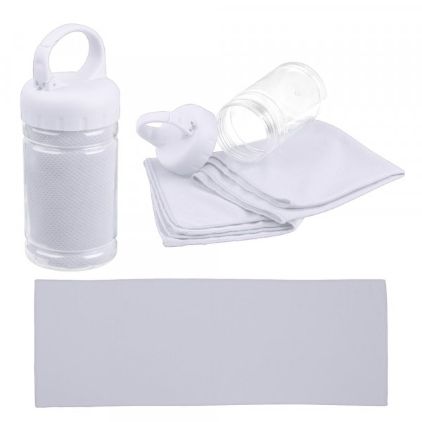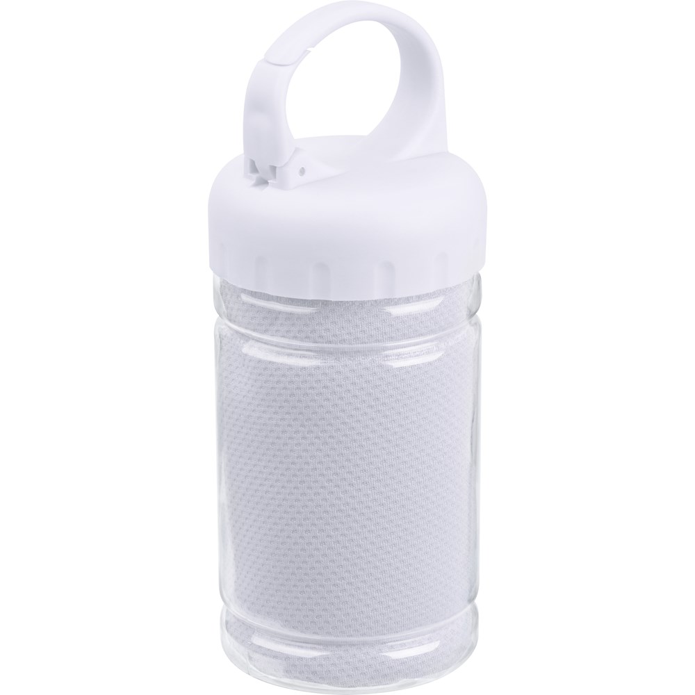 Toller Begleiter beim Sport, ständig gekühltes Handtuch (Polyester, Grammatur 160gsm) durch Kapillareffekt, verpackt in einer Kunststoffflasche mit Karabiner. Ihre Werbung drucken wir auf die Flasche.