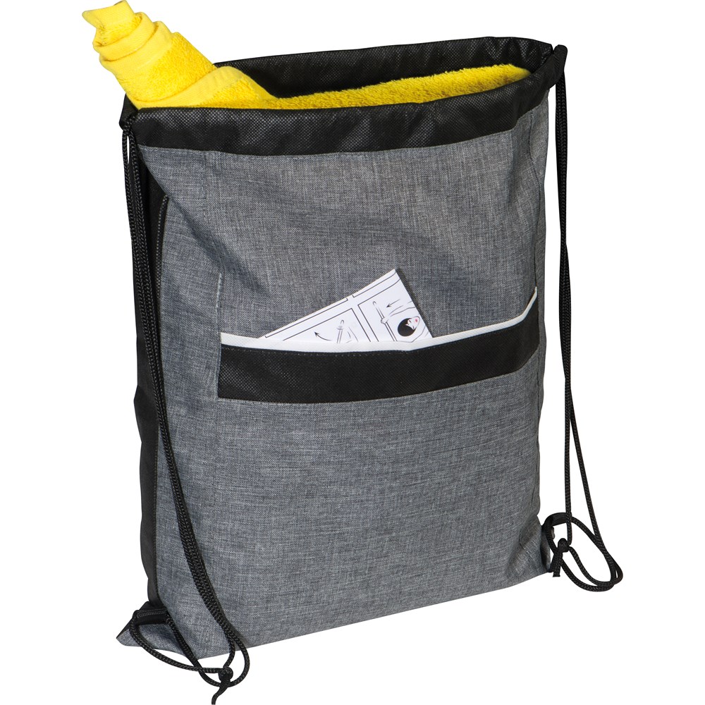 Sportbeutel aus 300D Snow-Polyester und Non Woven mit Vorfach. Hier findet sich Platz für sämtliche Sportutensilien. Ihre Werbung wird auf das Vorfach gedruckt.