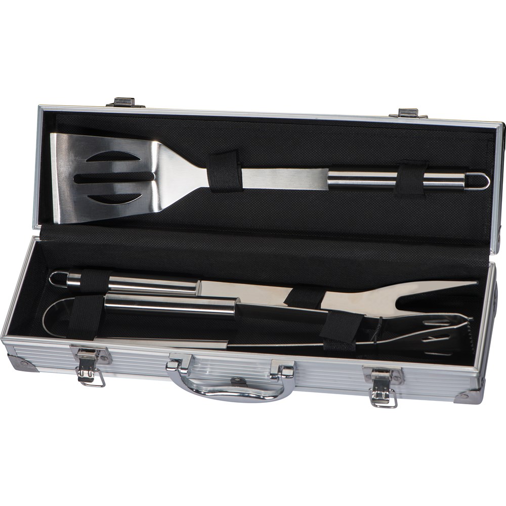 TOP PRICE! Grillkoffer bestehend aus Grillzange, Fleischgabel und Grillwender im Metallkoffer. Ihre Werbung lasern wir auf das ovale Metallschild des Koffers.