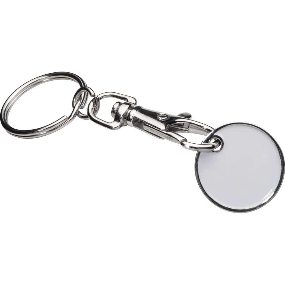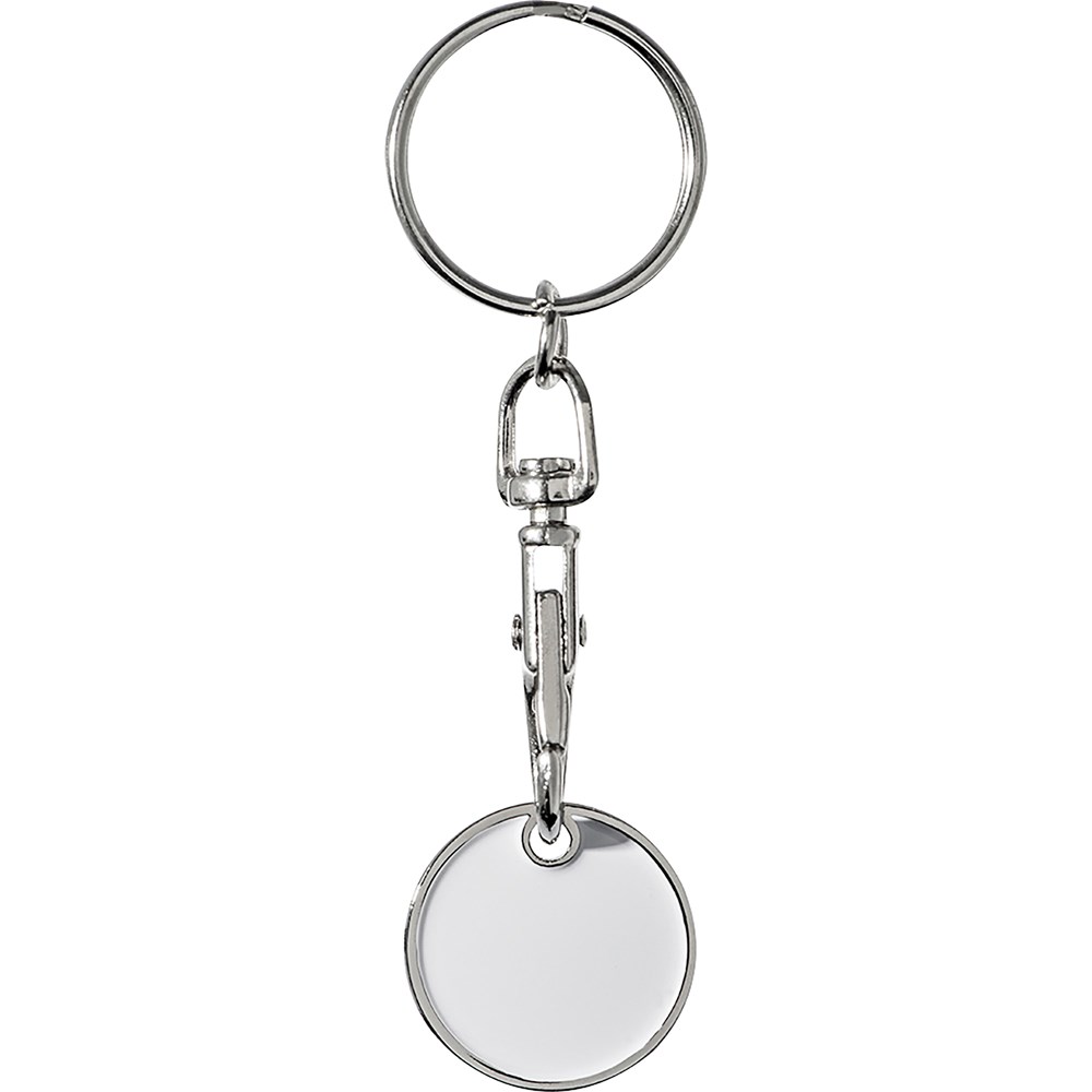 Schlüsselanhänger mit einem durch einen Karabinerhaken abnehmbaren Einkaufswagenchip. Die eine Seite des Chips ist farbig. Ihre Werbung gravieren wir auf die silberne Seite des Chips.