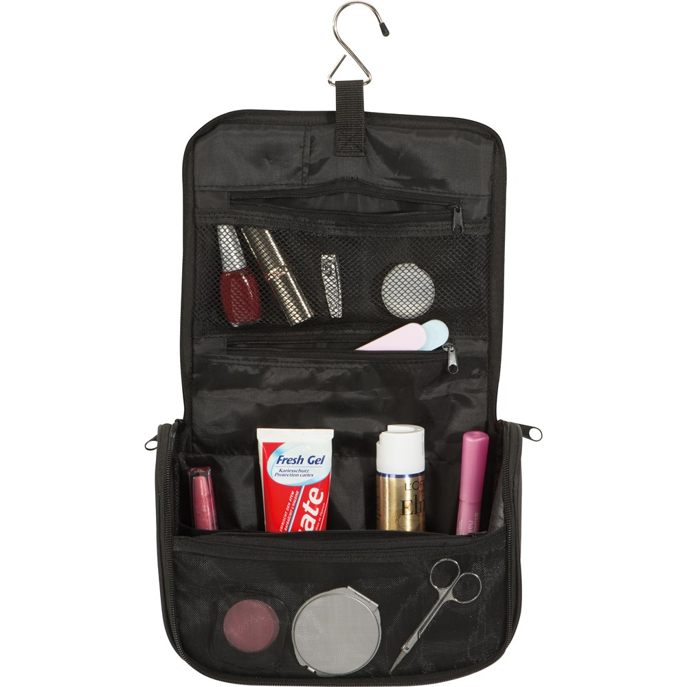 Kulturtasche aus 190D Nylon mit einem großen Innenfach, drei Reißverschlussfächern, vier Gummibändern und einem Haken zum Aufhängen. Ihre Werbung wird vorne auf die Tasche gedruckt.