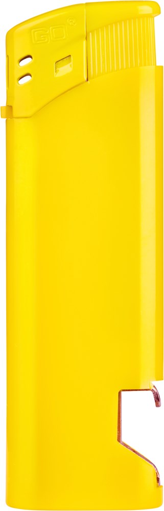 Das Reibradfeuerzeug aus Kunststoff der Marke GO verfügt zusätzlich über einen Flaschenöffner. Diese Kombination macht der Werbeartikel noch beliebter und zu einem Werbeklassiker. Das Feuerzeug ist nachfüllbar.