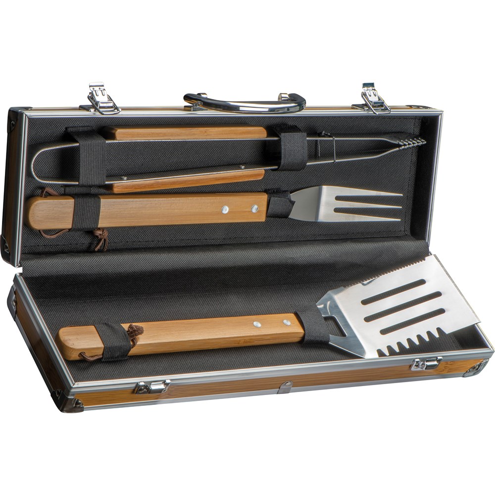 Unser 3-teiliges BBQ Besteckset ist die ideale Ergänzung für Grillenthusiasten und Genießer, die Wert auf Qualität und Stil legen. Dieses Set umfasst eine Grillzange, eine Fleischgabel und einen Wender, alles verpackt in einem hochwertigen Aluminiumkoffer mit stilvollen Bambusapplikationen.