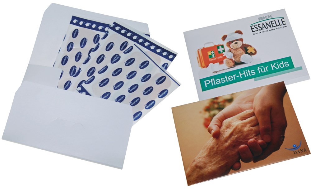Unser Pflastermäppchen ist individuell gestaltbar und mit 3 Doppelstreifen (19mm x 72mm) befüllt. Es handelt sich um Original Hartmann-Pflaster, im wiederverschließbaren Pappetui, Maße: 10 x 7,5 cm