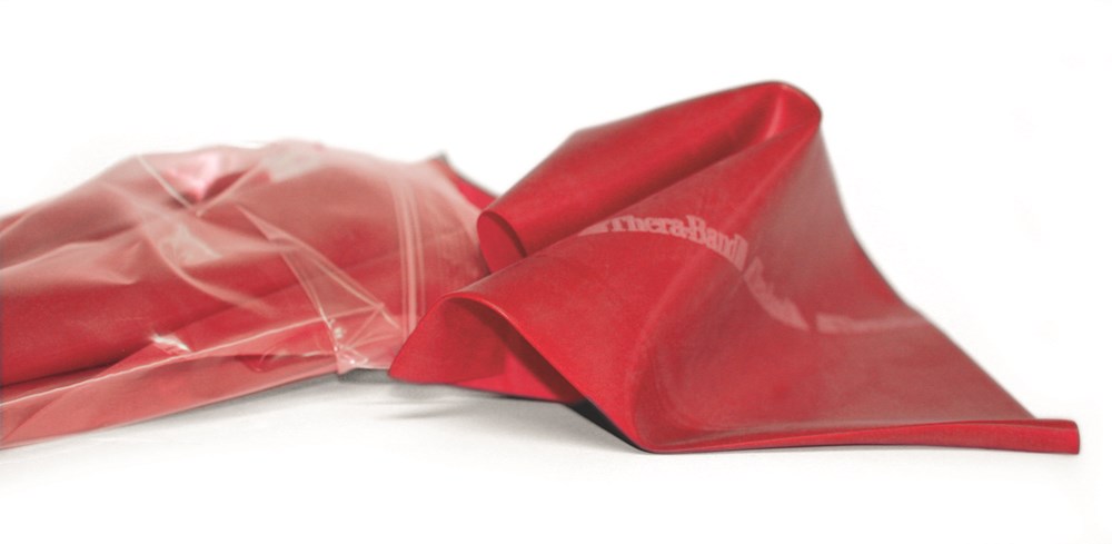 Original Theraband, mit Übungsbroschüre, verpackt in einem Polybeutel. Gelb = extraleichte Zugkraft, Rot = leichtere Zugkraft, Grün = mittlere Zugkraft, Blau = extrastarke Zugkraft, Schwarz = spezialstarke Zugkraft