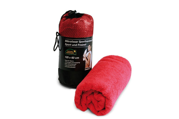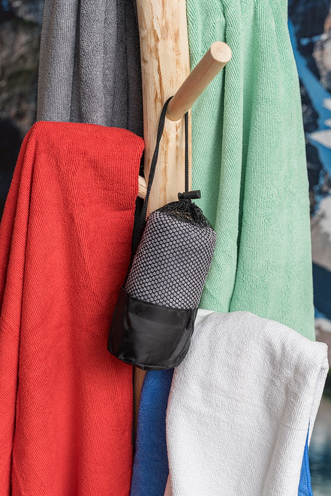 Mittelgroßes Handtuch 60x120 cm aus 85% Polyester und 15% Polyamid (Mikrofaser-Frottee 280 g/m²), verpackt in einem schwarzen Netzbeutel mit Infobanderole, die auf Wunsch selbst gestaltet werden kann.