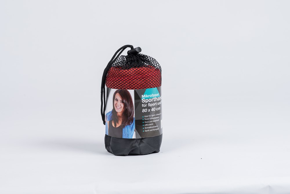 Kleines Sporthandtuch 40x80cm aus 85% Polyester und 15% Polyamid (Mikrofaser-Frottee 280 g/m²), verpackt in einem schwarzen Netzbeutel mit Infobanderole, die auf Wunsch selbst gestaltet werden kann.