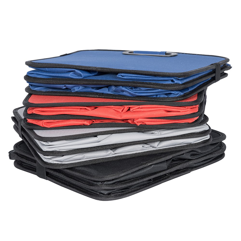 Der zusammenfaltbare Organizer mit integrierten Tragegriffen bietet viel Platz zum Verstauen von Einkäufen, Autozubehör, Büromaterial und vielem mehr. Die Faltbox beinhaltet zwei Fächer mit je einem Netzeinsteckfach und ist durch den verstärkten Einlegeboden äußerst robust und gut geeignet für schweren Inhalt. Maße: 50x32x27 cm