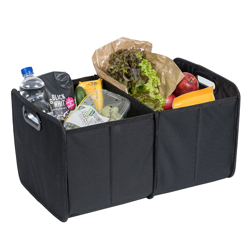 Der zusammenfaltbare Organizer mit integrierten Tragegriffen bietet viel Platz zum Verstauen von Einkäufen, Autozubehör, Büromaterial und vielem mehr. Die Faltbox beinhaltet zwei Fächer mit je einem Netzeinsteckfach und ist durch den verstärkten Einlegeboden äußerst robust und gut geeignet für schweren Inhalt. Maße: 50x32x27 cm