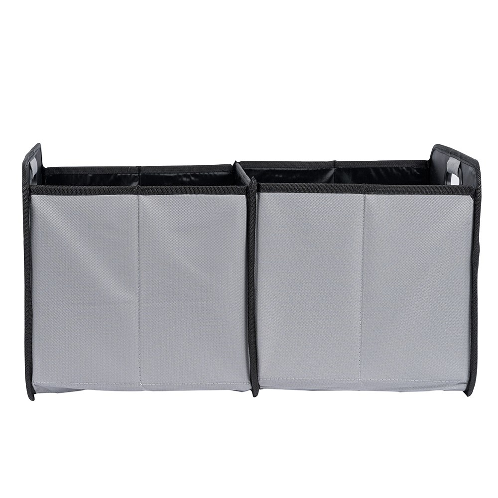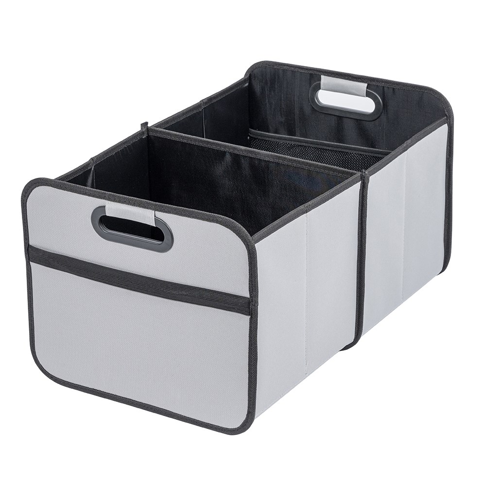 Der zusammenfaltbare Organizer mit integrierten Tragegriffen bietet viel Platz zum Verstauen von Einkäufen, Autozubehör, Büromaterial und vielem mehr. Die Faltbox beinhaltet zwei Fächer mit je einem Netzeinsteckfach und ist durch den verstärkten Einlegeboden äußerst robust und gut geeignet für schweren Inhalt. Maße: 50x32x27 cm