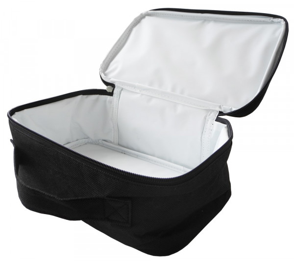 Kleine Vespertasche ideal für die Arbeit und unterwegs. Mit Tragehenkel und Reißverschluss. Non Woven, Innenseite PEVA in Fb. weiß, Isolierschaum, Reißverschluss über 3 Seiten, Handgriff an der Vorderseite.