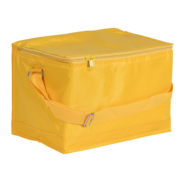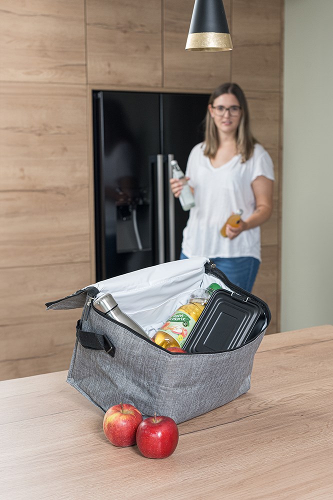 Praktische Kühltasche aus Polyester D210 mit Reißverschluss, Tragegurt und integriertem Netzfach im Inneren. Die Kühltasche ist PEVA-isoliert. Maße: 34 x 22 x 23 cm
