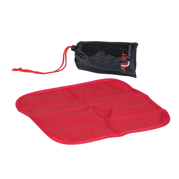 Faltbares Sitzkissen aus Polyester 600D mit Thermo-Isolierfolie auf der Unterseite, die vor Nässe und Kälte schützt. Zum Produkt gehört ein schwarzer Polyesterbeutel mit zum Kissen farblich passendem Kordelzug, in welchem das gefaltete Kissen aufbewahrt werden kann. Die Werbeanbringung kann auf dem Sitzkissen und/oder auf dem Beutel erfolgen.