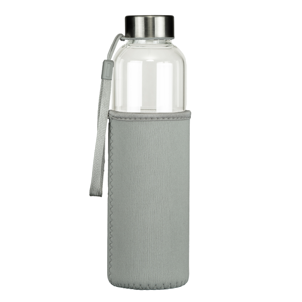Trinkflasche aus stabilem Borosilikat-Glas mit Edelstahl Schraubverschluss und Silikondichtung. Mit Neoprenhülle, welche die Temperatur länger konstant hält und vor Verbrennungen schützt. Inhalt: 500 ml