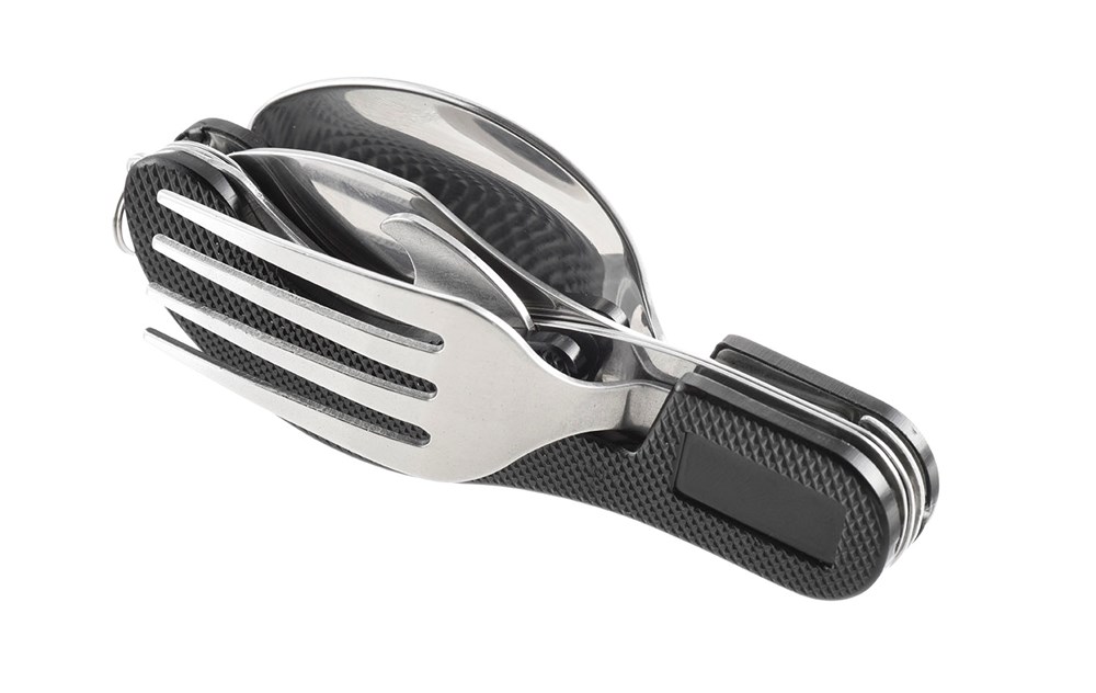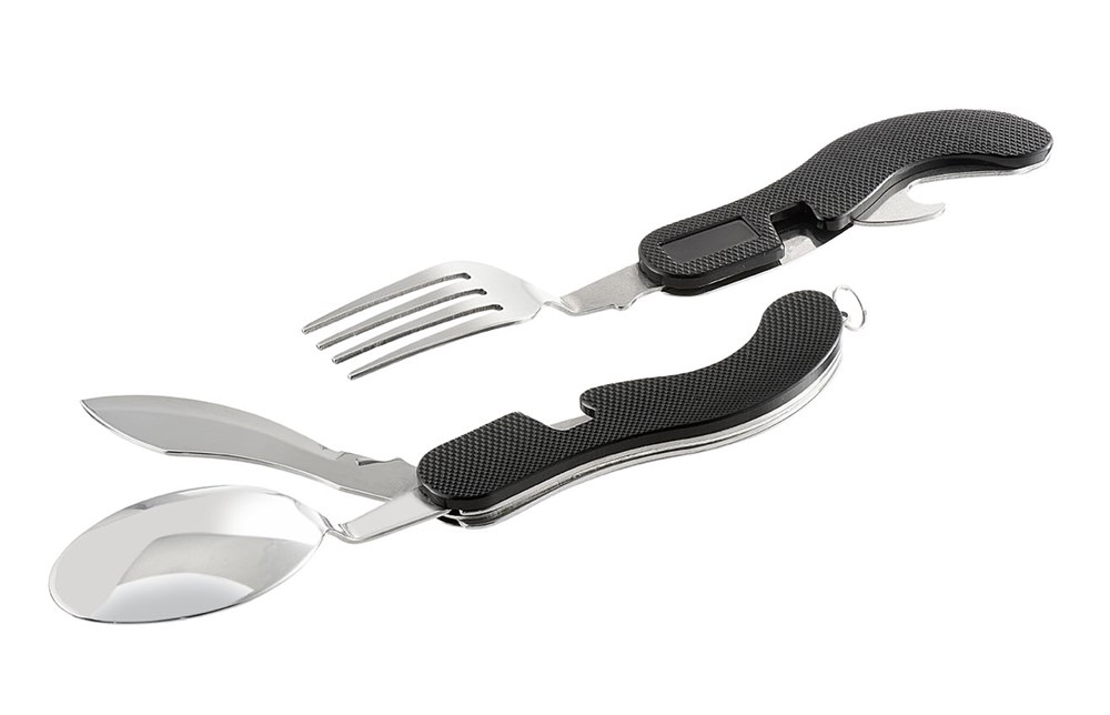 Das Campingbesteck leistet nicht nur passionierten Reisenden und Fans des Lagerfeuers gute Dienste. Alle Berufsgruppen, die sich unterwegs mit einer Pausenmahlzeit versorgen, schwören auf ihr Klappbesteck mit Löffel, Gabel, Messer, Dosen- und Flaschenöffner. Das Besteck kann bei ausgeklappter Gabel und Löffel durch gegeneinander schieben der beiden Hälften entriegelt und einzeln benutzt werden. In robustem Täschchen mit Gürtelschlaufe. Maße 10 x 4cm. VE 80/10 Stück.