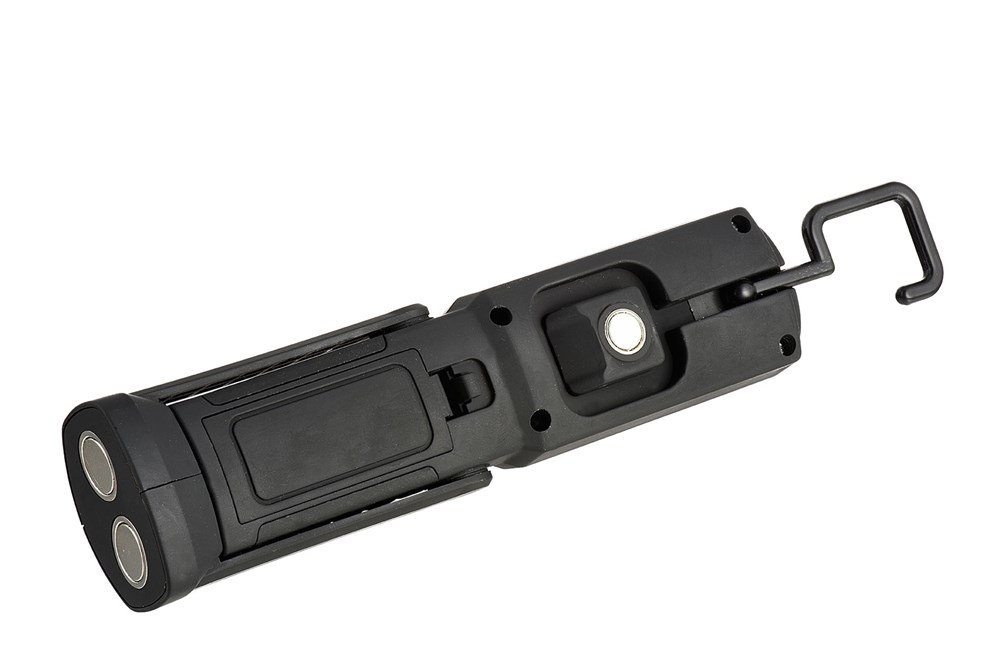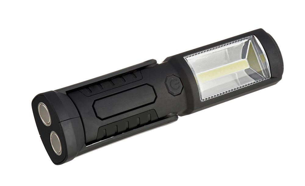 Magnete am Fuß und Rücken der Lampe bieten einen sicheren Stand, plus Haken zum Aufhängen. Mit der stufenverstellbaren Achse kann die Lampe punktgenau in Position gebracht werden. Die Frontseite strahlt mit 3W COB LED (150 Lumen), plus 3 LED (25 Lumen) am Lampenkopf. Betrieb durch 3 x AAA Batterien (enthalten). Maße 3,5 x 16,5cm. VE 50/25 Stück.