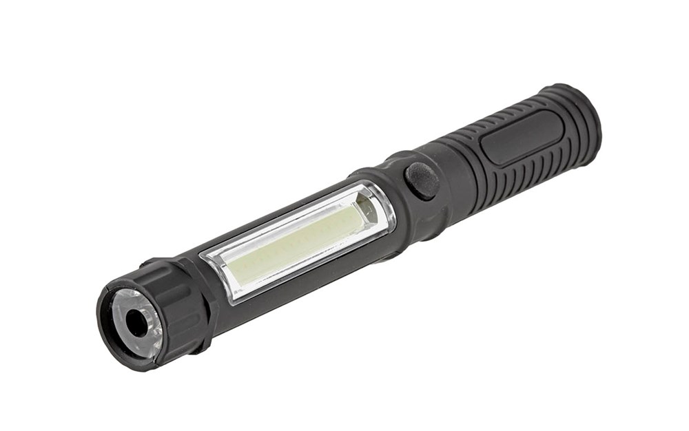 leuchtstarke Taschenlampe mit 1W LED (50 Lumen) plus seitlicher Arbeitsleuchte mit 1W (100 Lumen). Mit Magnet und Clip. Betrieb durch 3 x AAA Batterien (enthalten). Maße 16,7 x 2,2cm. VE 100/50 Stück.