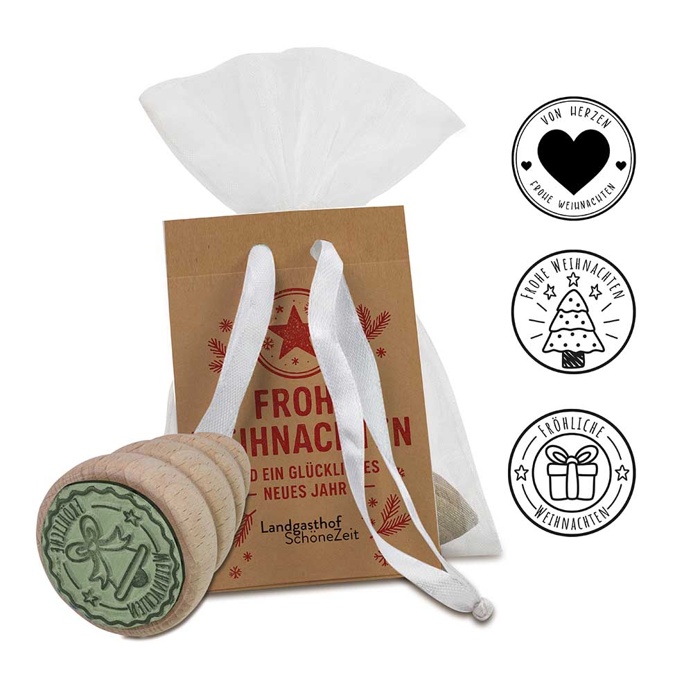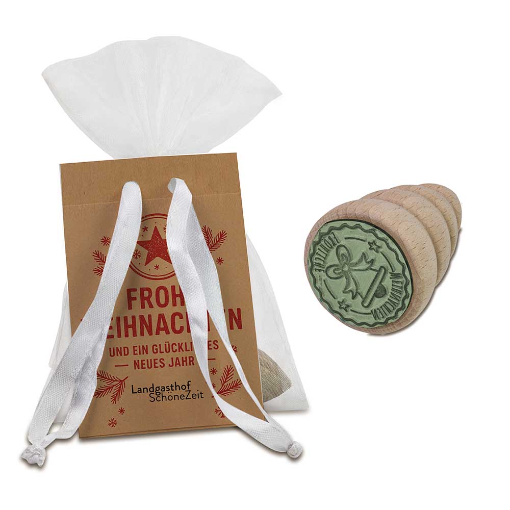 Unser festlicher Holzstempel ist ein charmantes Giveaway zur Weihnachtszeit – mit Stil, Emotion und Herz. Der unbehandelte Holzgriff in Form einer Tanne liegt angenehm in der Hand und der Gummistempel sorgt für klare Abdrucke. Erhältlich in den drei liebevoll gestalteten Weihnachtsmotiven Tanne, Geschenk und Herz. Verpackt in einem Organzasäckchen mit individuellem Hangtag – ideal als persönliche Aufmerksamkeit oder stimmungsvolles Werbegeschenk.