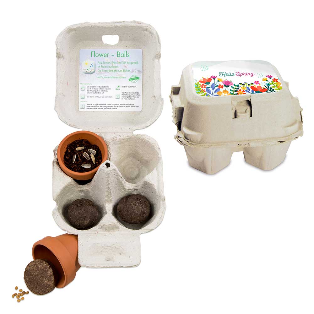 Es grünt und blüht im Büro und vor der Tür – diese Kombination steckt in diesem nachhaltigen Werbegeschenk. Verpackt im Original Eierkarton mit großem, individuellen Werbeaufkleber auf der Außenseite. Der Kunde erhält zwei Ton-Töpfchen mit Eierbaum- bzw. Sonnenblumensamen für den Blumengruß auf Schreibtisch oder Fensterbank. Um Futter für die Bienen und Schmetterlinge auch nach draußen zu bringen, werden zusätzlich zwei Flower-Balls - kleine Kugeln, bestehend aus Samen, Erde und Tonpulver - geliefert. Diese werden beliebig und direkt auf dem Boden verteilt und motivieren den Beschenkten im Stile von Guerilla-Gardening aktiv zu werden.