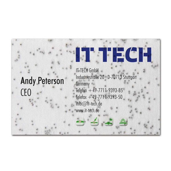 Möchten Sie einen bleibenden Eindruck bei Ihren Geschäftspartnern hinterlassen? Visitenkarten aus Samenpapier sind eine kreative und individuelle Lösung. Diese Karten werden nach Ihren Wünschen gestaltet und enthalten Samen, die im Papier integriert sind. Mögliche Samensorten: Blumenmischung, Kräutermischung, Mohnblume, Thymian.