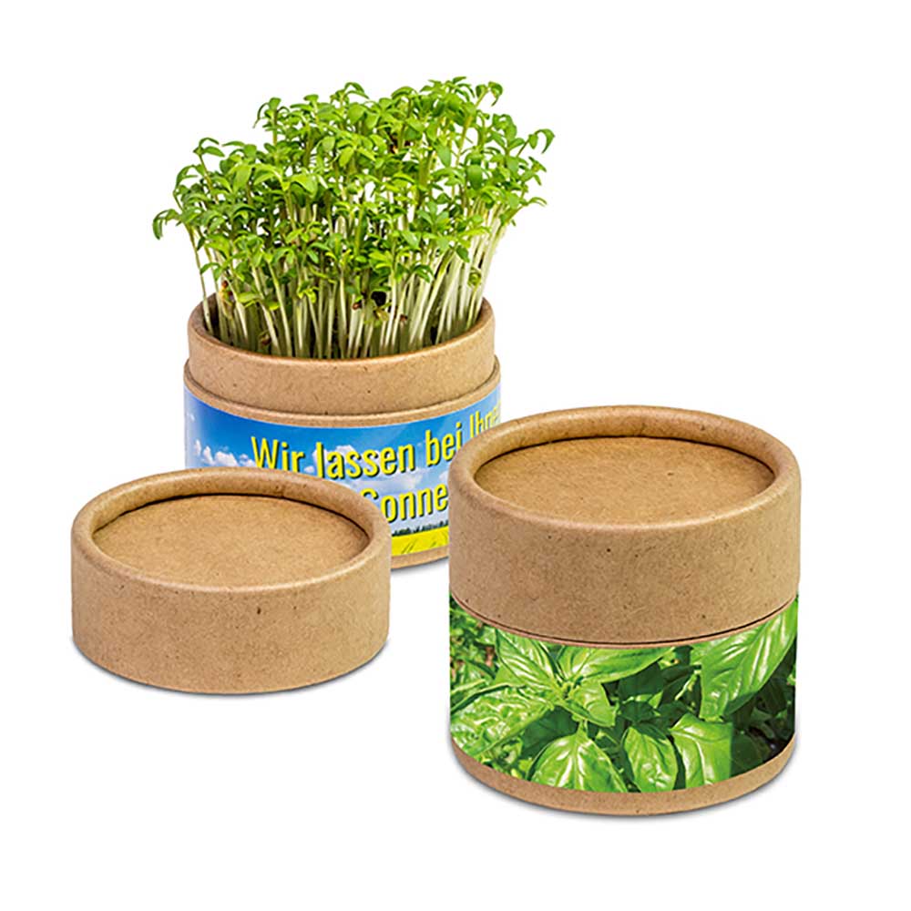 Aus Kraftpapier produziert und mit Wachs versiegelt, ist der Pflanz-Cup ein Highlight im Bereich „werben&wachsen“. Im runden Behältnis werden mit einer Substrattablette als Erde, Samen nach Wahl und Wasser schöne Pflänzchen für Fenstersims oder Bürotisch herangezogen. Die umlaufende Banderole kann individuell bedruckt werden. Verschlossen wird dieses kreative Produkt mit einem Deckel, ebenfalls aus Kraftpapier.