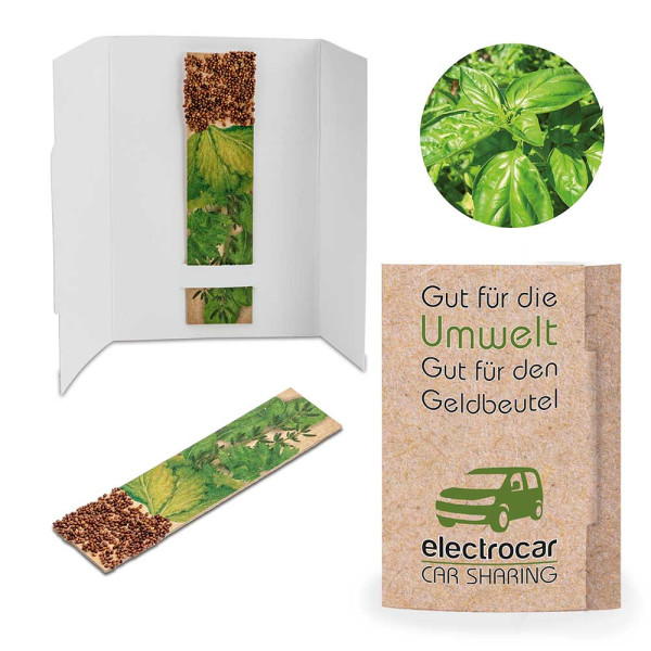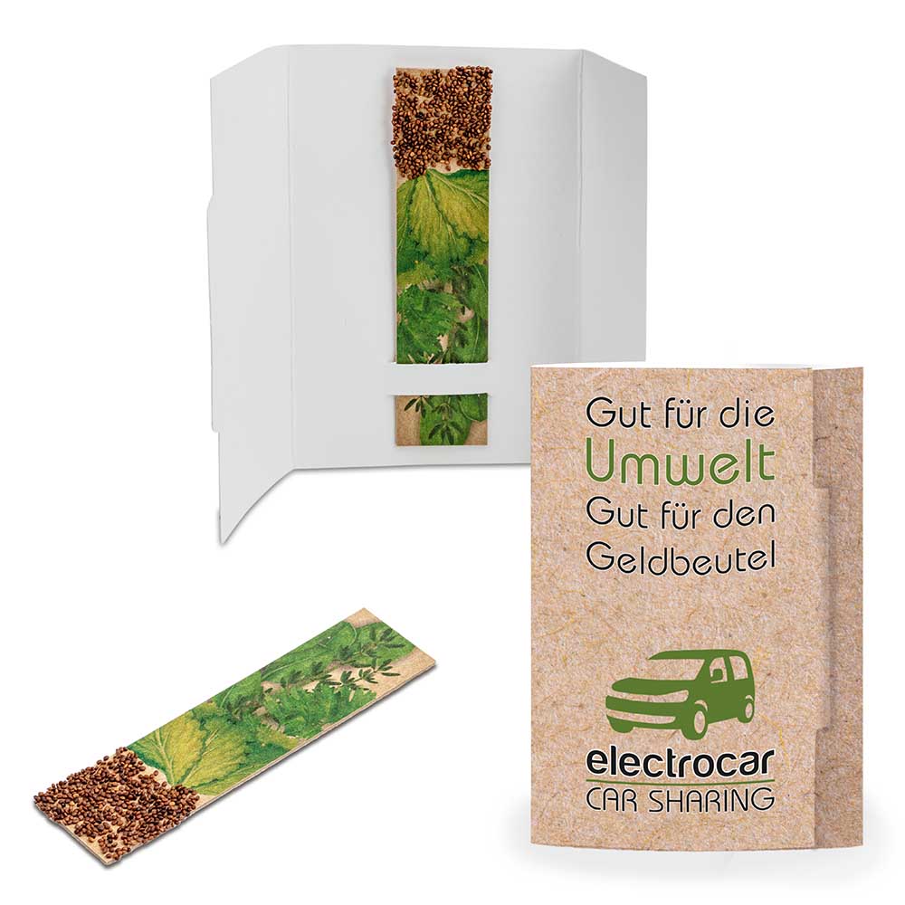 Frische Kräuter verfeinern jedes Essen und betören mit ihrem Duft. Am besten schmecken sie natürlich, wenn man sie selbst gezüchtet hat. Mit dem Kräuter-Stick geht das jetzt auf jeder Fensterbank, dem Bürotisch oder im Freien ganz einfach. Auf dem Pappstreifen aus Kraftpapier, bedruckt mit einem Bild leckerer Kräuter, werden mit Wachs Samen angebracht. Steckt man diesen nun in Erde und gießt fleißig, keimen leckere Gartenkräuter daraus. Die Verpackung in flacher Kartenform kann rundum gestaltet und bedruckt werden und ist durch die flache Form ein ideales Printmailing-Produkt. Lieferbar mit den Sorten Gartenkresse, Basilikum, Thymian, Majoran, Schnittlauch, Schnittsalat oder Petersilie. Also schnell ran an die veganen Superfoods.