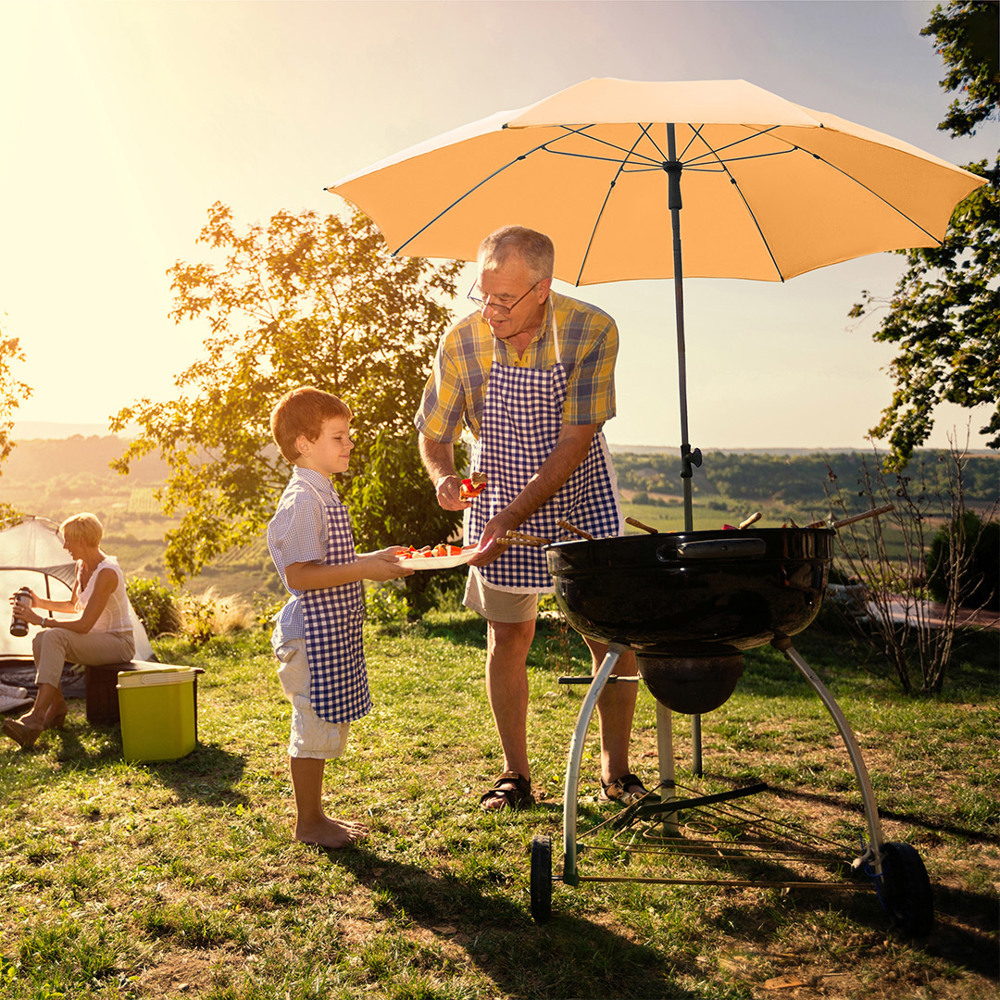 Moderner Sonnenschirm mit Gestell in Titan-Finish und Knickvorrichtung Einfache Handhabung durch Sicherheitsschieber, sehr stabile Fiberglasschienen, zweiteiliger und stufenlos höhenverstellbarer Stock mit Knickvorrichtung zur Neigung des Schirms, Schienen und Stock in edlem Titan-Finish, Unterstock mit ca. 125 cm Länge und Drehfeststeller zur sicheren Fixierung, komfortables Tragefutteral, hochqualitativer Bezug mit einer Grammatur von ca. 200 g/m² und Lichtschutzfaktor UPF 50+, überlappender Ventilationsbezug zur Regulierung von Überdruck durch stärkere Windböen, exklusive Füllständer (Art. 8920)