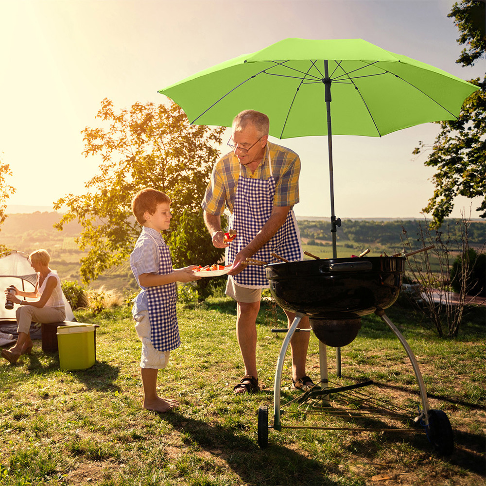 Moderner Sonnenschirm mit Gestell in Titan-Finish und Knickvorrichtung Einfache Handhabung durch Sicherheitsschieber, sehr stabile Fiberglasschienen, zweiteiliger und stufenlos höhenverstellbarer Stock mit Knickvorrichtung zur Neigung des Schirms, Schienen und Stock in edlem Titan-Finish, Unterstock mit ca. 125 cm Länge und Drehfeststeller zur sicheren Fixierung, komfortables Tragefutteral, hochqualitativer Bezug mit einer Grammatur von ca. 200 g/m² und Lichtschutzfaktor UPF 50+, überlappender Ventilationsbezug zur Regulierung von Überdruck durch stärkere Windböen, exklusive Füllständer (Art. 8920)
