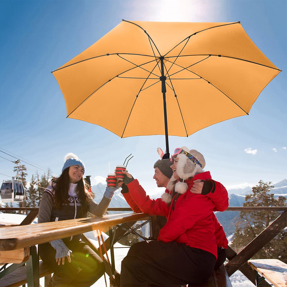 Moderner Sonnenschirm mit Gestell in Titan-Finish und Knickvorrichtung Einfache Handhabung durch Sicherheitsschieber, sehr stabile Fiberglasschienen, zweiteiliger und stufenlos höhenverstellbarer Stock mit Knickvorrichtung zur Neigung des Schirms, Stock in edlem Titan-Finish, Unterstock mit ca. 119 cm Länge und Drehfeststeller zur sicheren Fixierung, komfortables Tragefutteral, hochqualitativer Bezug mit einer Grammatur von ca. 200 g/m² und Lichtschutzfaktor UPF 50+, exklusive Füllständer (Art. 8920 oder Art. 8905) / Erdspieß (Art. 8939)