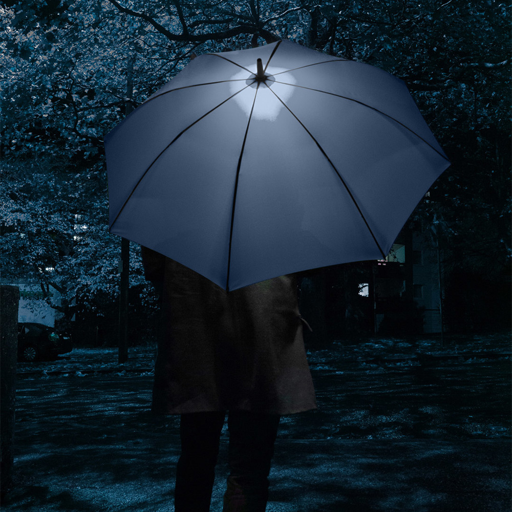 Effektvoller Automatik-Stockschirm in mittlerer Größe mit LED-Innenbeleuchtung Komfortable Automatik-Funktion zum schnellen Öffnen, hochwertiges Windproof-PLUS-System für eine maximale Gestell-Flexibilität bei stärkeren Windböen, flexible Fiberglasschienen, Soft-Feel-Griff mit integrierter Auslösetaste, Taste zum Ausschalten des Lichts und Werbeanbringungsmöglichkeit, höherer Korrosionsschutz durch schwarze Galvanisierung des Stahlstocks, WEEE-Reg.-Nr. DE 14360689, Batt-Reg.-Nr. DE 52803080, Batterien (3 x AAA) im Lieferumfang enthalten.