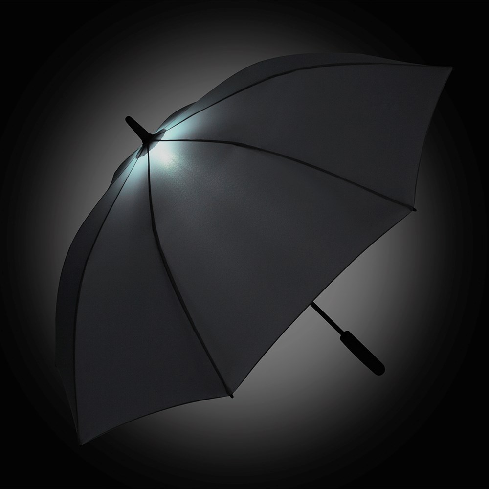 Effektvoller Automatik-Stockschirm in mittlerer Größe mit LED-Innenbeleuchtung Komfortable Automatik-Funktion zum schnellen Öffnen, hochwertiges Windproof-PLUS-System für eine maximale Gestell-Flexibilität bei stärkeren Windböen, flexible Fiberglasschienen, Soft-Feel-Griff mit integrierter Auslösetaste, Taste zum Ausschalten des Lichts und Werbeanbringungsmöglichkeit, höherer Korrosionsschutz durch schwarze Galvanisierung des Stahlstocks, WEEE-Reg.-Nr. DE 14360689, Batt-Reg.-Nr. DE 52803080, Batterien (3 x AAA) im Lieferumfang enthalten.