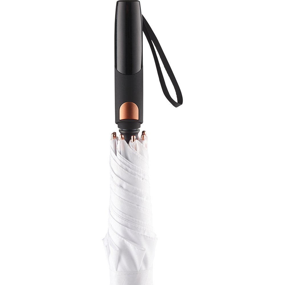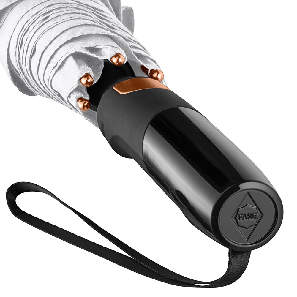 Edler Automatik-Gästeschirm für zwei Personen mit Elementen in Metallic-Farben Komfortable Automatik-Funktion zum schnellen Öffnen, hochwertiges Windproof-PLUS-System für eine maximale Gestell-Flexibilität bei stärkeren Windböen, flexible Fiberglasschienen, Aluminiumstock in matter Metallic-Farbe, Metall-Spitzen und Metall-Druckknopf am Schließband farblich passend zum Stock, matt/glänzend abgesetzter Soft-Feel-Griff mit integrierter Auslösetaste und Werbeanbringungsmöglichkeit