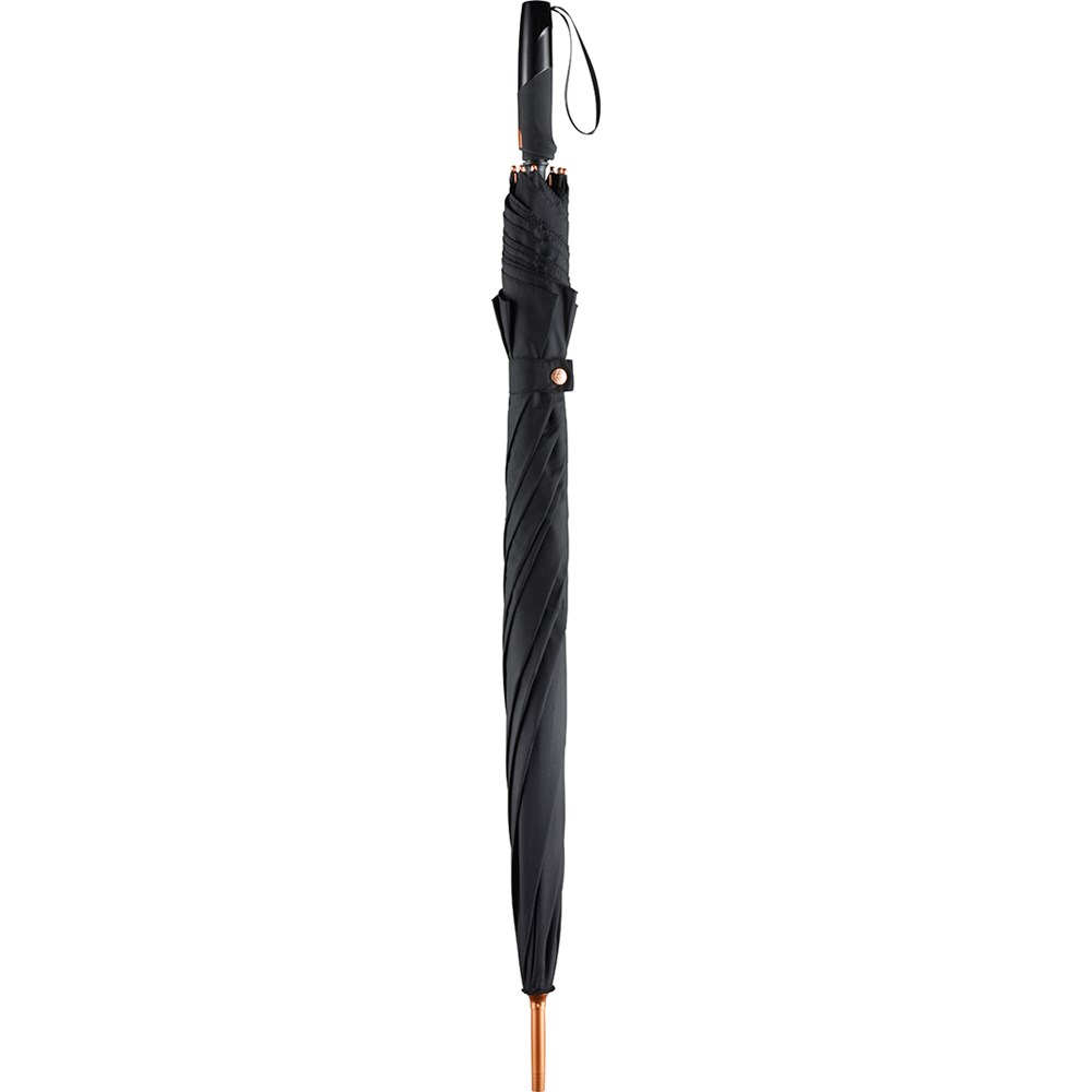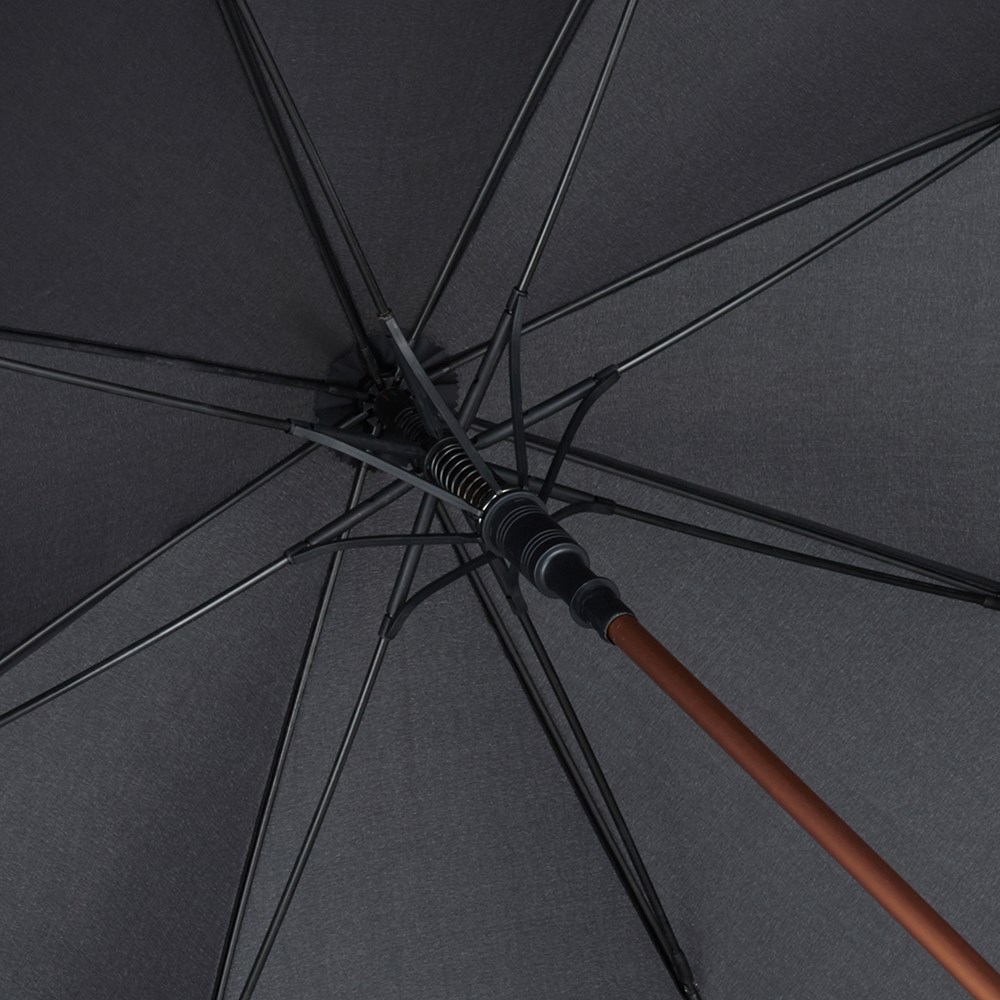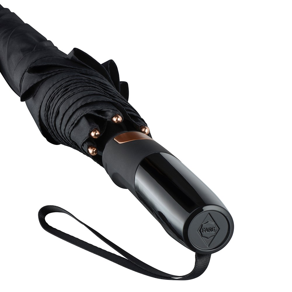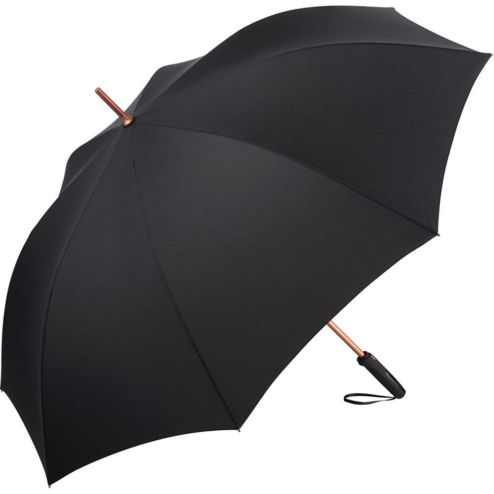 Edler Automatik-Gästeschirm für zwei Personen mit Elementen in Metallic-Farben Komfortable Automatik-Funktion zum schnellen Öffnen, hochwertiges Windproof-PLUS-System für eine maximale Gestell-Flexibilität bei stärkeren Windböen, flexible Fiberglasschienen, Aluminiumstock in matter Metallic-Farbe, Metall-Spitzen und Metall-Druckknopf am Schließband farblich passend zum Stock, matt/glänzend abgesetzter Soft-Feel-Griff mit integrierter Auslösetaste und Werbeanbringungsmöglichkeit