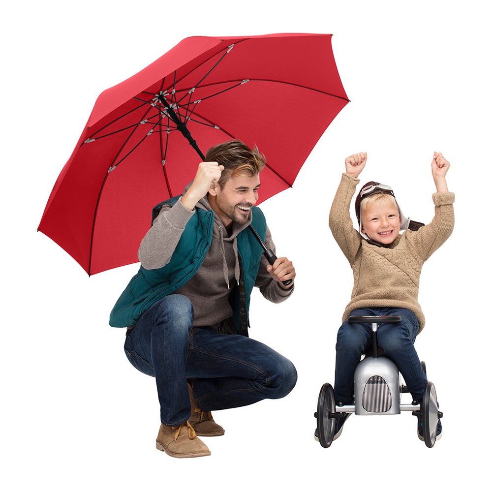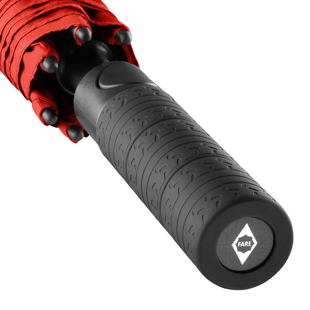 Exklusiver Automatik-Golf-/Gästeschirm für zwei Personen mit Reifenprofil-Design-Elementen Komfortable Automatik-Funktion zum schnellen Öffnen, hochwertiges Windproof-PLUS-System für eine maximale Gestell-Flexibilität bei stärkeren Windböen, flexible Fiberglasschienen mit grauen Gelenken, handsympathischer Soft-Feel-Griff im Reifenprofil-Design mit integrierter Auslösetaste und Werbeanbringungsmöglichkeit. Auch als Taschenschirm (Art. 5455) erhältlich.