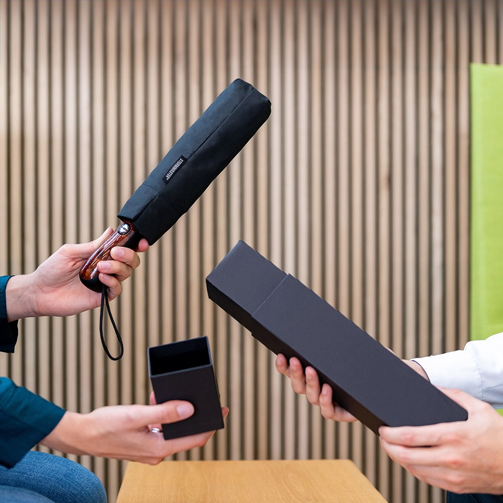 Extrem stabiler Doppelautomatik-Taschenschirm in Übergröße in hochwertiger Einzelkartonage Komfortable Doppelautomatik-Funktion zum schnellen Öffnen und Schließen, hochwertiges Windproof-PLUS-System für eine maximale Gestell-Flexibilität bei stärkeren Windböen, besonders robuste Spezial-Schienenkonstruktion aus Kunststoff und Fiberglas, wassersparend gefärbtes Polyester-Pongee waterSAVE® Bezugsmaterial aus recycelten Kunststoffen, mit waterSAVE®-Label auf dem Schließband, Soft-Feel-Griff mit Applikationen in edler Holzoptik und integrierter Auslösetaste, einzeln verpackt in hochwertiger Einzelkartonage