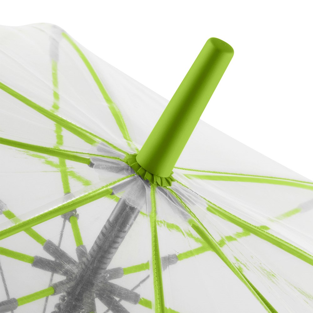 Ansprechender Automatik-Stockschirm mit transparentem Bezug und farbigen Details Komfortable Automatik-Funktion zum schnellen Öffnen, hochwertiges Windproof-PLUS-System für eine maximale Gestell-Flexibilität bei stärkeren Windböen, flexible Fiberglasschienen, farblich aufeinander abgestimmte Design-Elemente, handsympathischer Soft-Touch-Rundhakengriff mit integrierter Auslösetaste und Werbeanbringungsmöglichkeit, höherer Korrosionsschutz durch schwarze Galvanisierung des Stahlstocks